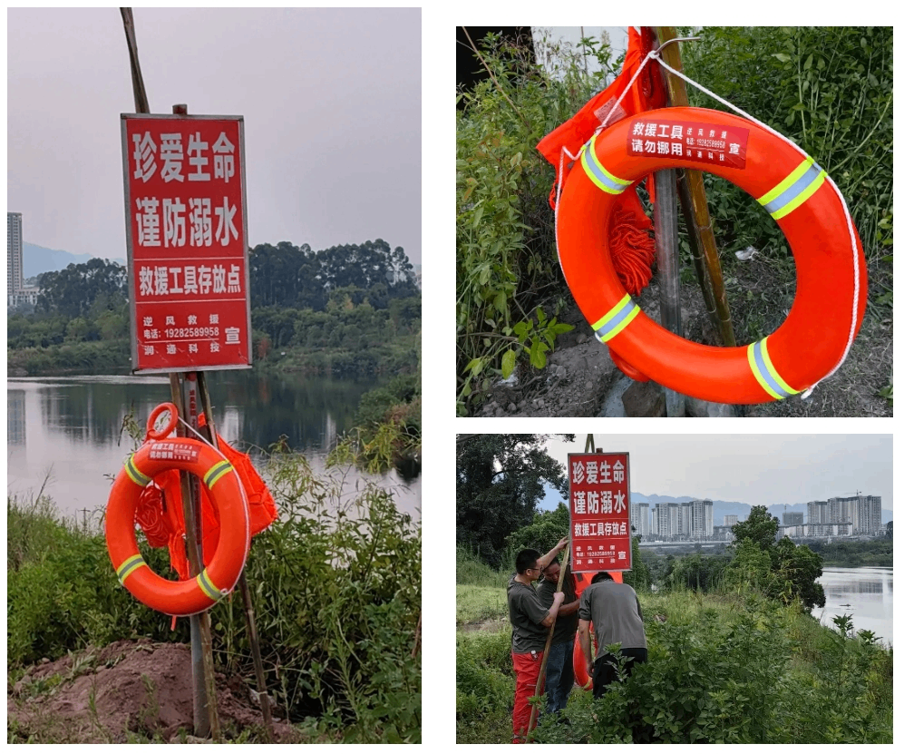 集團安全管理工程師張德洪和逆風救援隊一同針對雙福、圣泉街道溺水事件高發的河、湖、水庫地理位置進行勘察考證,并于8月中旬,在所有區域設置10余個防溺水警示牌和救生工具點,投放救援工具百余件,全力守護防溺水“最后一道防線”,構筑鞏固防溺水安全屏障。